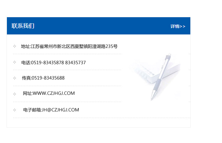 傳真:0519-83435688    郵編:213135    網址:WWW.czjhgj_com.huhong-shucai.com    電子郵箱:JH@czjhgj_com.huhong-shucai.com